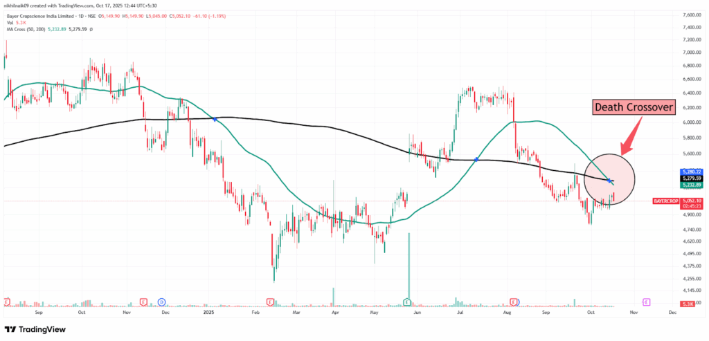 The death crossover took place on the 15th of October 2025, at the price of Rs. 5,280.22 with a decent volume of 12.73 K. The stock closed at Rs. 5,023.40 in Friday’s session, reflecting a 1.76 percent decrease in the intraday trade.