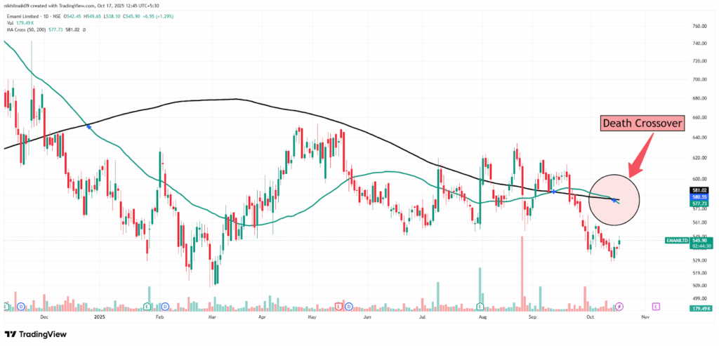 The death crossover took place on the 15th of October 2025, at the price of Rs. 580.55 with a decent volume of 672.41 K. The stock closed at Rs 551.50 in Friday’s session, reflecting a 2.33 percent increase in the intraday trade.
