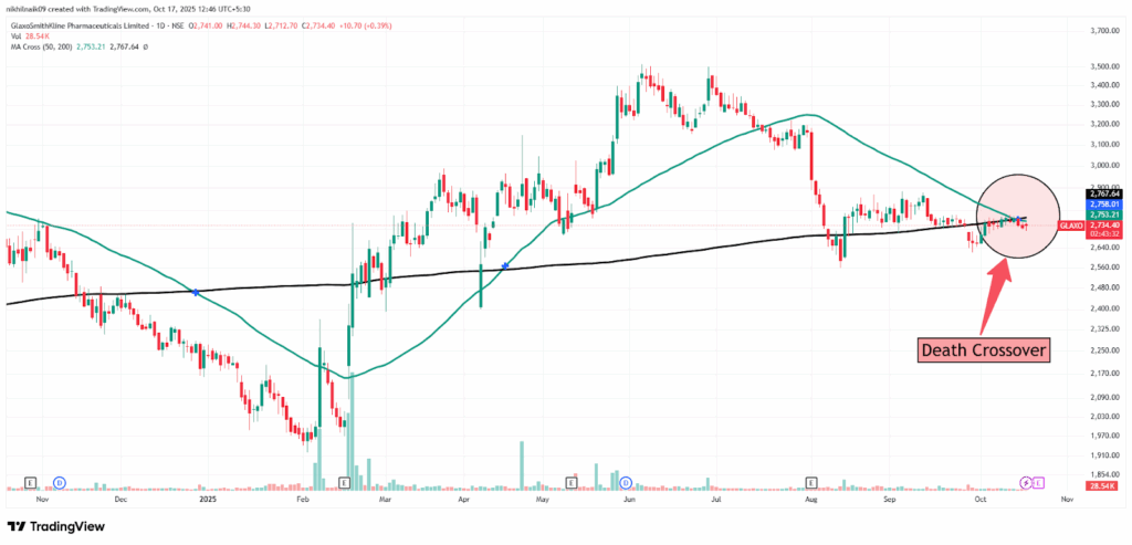 The death crossover took place on the 15th of October 2025, at the price of Rs. 2,758.01 with a decent volume of 33.15 K. The stock closed at Rs. 2,742.90 in Friday’s session, reflecting a 0.70 percent increase in the intraday trade.