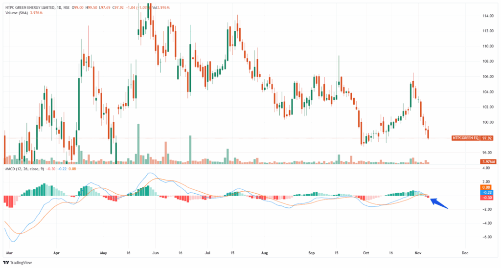 With market capitalization of Rs. 82,578 cr, the shares of NTPC Green Energy Ltd are closed at Rs. 98 per share, from its previous close of Rs. 99 per share.