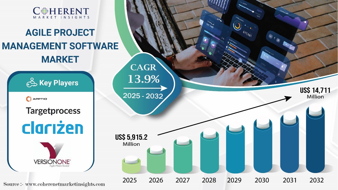 According to Coherent Market Insights (CMI), the global agile project management software market size is projected to grow at a CAGR of 13.9% between 2025 and 2032, reaching USD 5,915.2 Mn in 2025 and USD 14,711 Mn by 2032.
