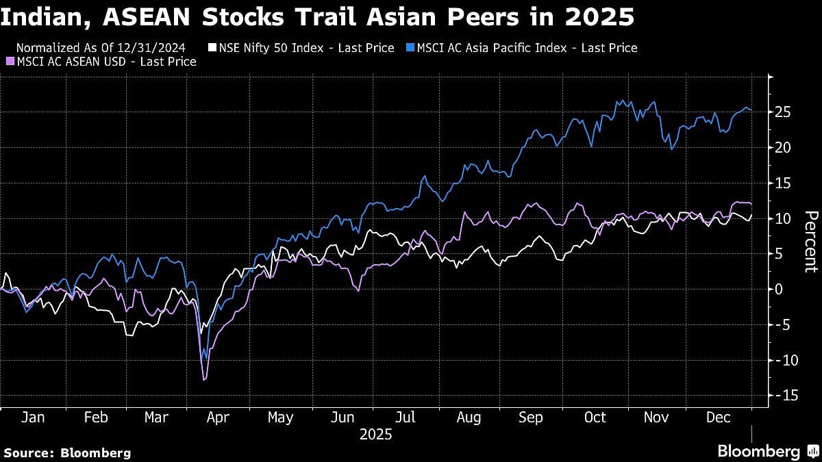 India’s NSE Nifty 50 Index finished 2025 up 10.5%, trailing the MSCI AC Asia Pacific Index by the widest margin since 1998. Investors expect lower consumption-tax rates and interest-rate cuts to help improve earnings and drive a trend reversal. Some also bet that Indonesia can benefit further from the government’s stimulus push. Southeast Asia overall lagged the broader region last year.