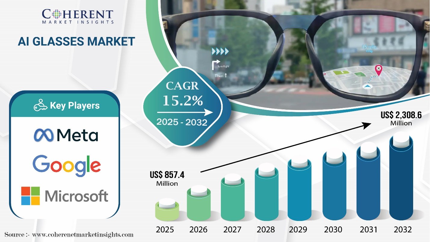 According to Coherent Market Insights (CMI), the global AI glasses market size is expected to grow nearly 2.7X during the forecast period, reaching USD 2,308.6 Mn by 2032, up from USD 857.4 Mn in 2025.