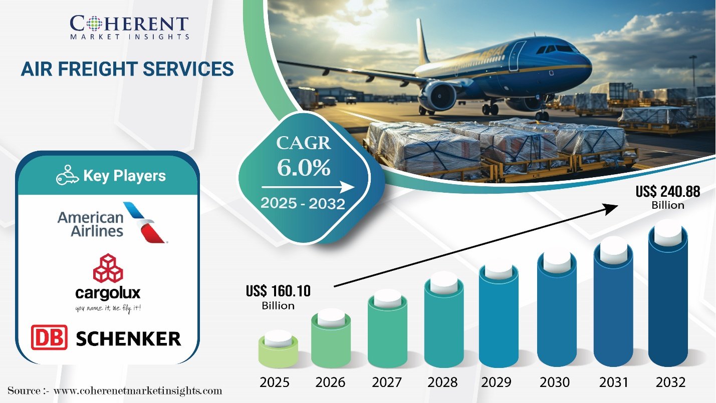 According to Coherent Market Insights (CMI), the global air freight services market size is expected to grow at a CAGR of 6.0% during the forecast period, reaching USD 240.88 Bn by 2032, up from USD 160.1 Bn in 2025.