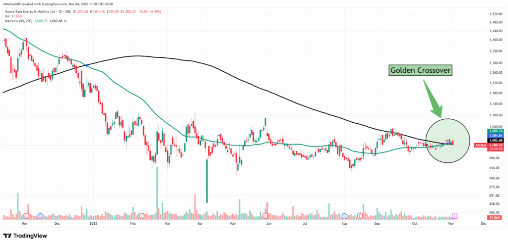 The golden crossover took place on October 30, 2025, at a price of Rs. 1,004.84 with decent volumes of 228.16 K shares. The stock closed at Rs. 990.10 in Tuesday’s session, reflecting a 1.99 percent decrease in the intraday trade.