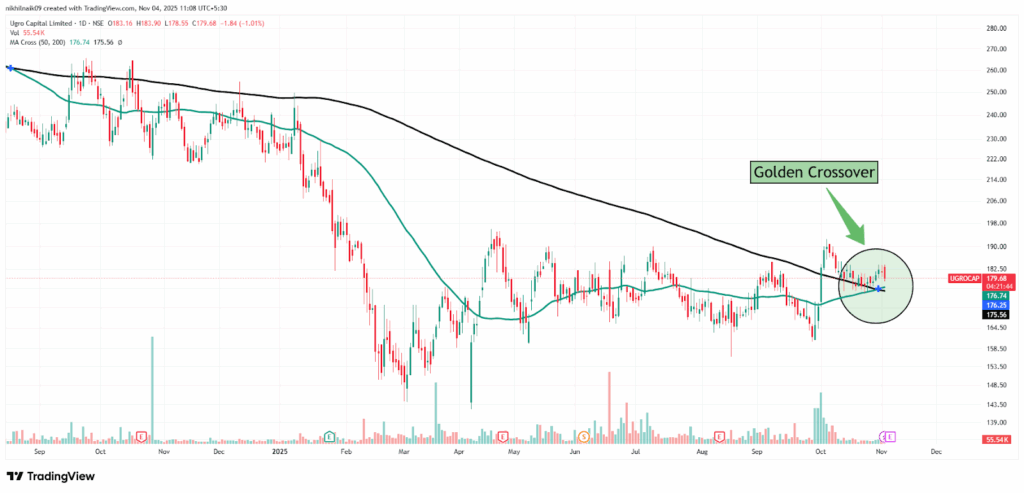 The golden crossover took place on October 31, 2025, at a price of Rs. 176.25 with decent volumes of 162.27 K shares. The stock closed at Rs. 177.84 in Tuesday’s session, reflecting a 2.03 percent decrease in the intraday trade.