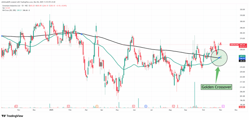 The golden crossover took place on October 30, 2025, at a price of Rs. 246.93 with decent volumes of 60.09 K shares. The stock closed at Rs. 265.30 in Tuesday’s session, reflecting a 0.04 percent increase in the intraday trade.