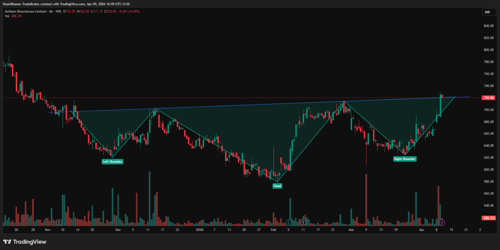 On Thursday, Anthem Biosciences Ltd broke above the neckline of an inverted head-and-shoulders pattern on the 4-hour chart. A sustained move above Rs 714 could lead to further upside, while a decline below this level may weaken the bullish outlook.