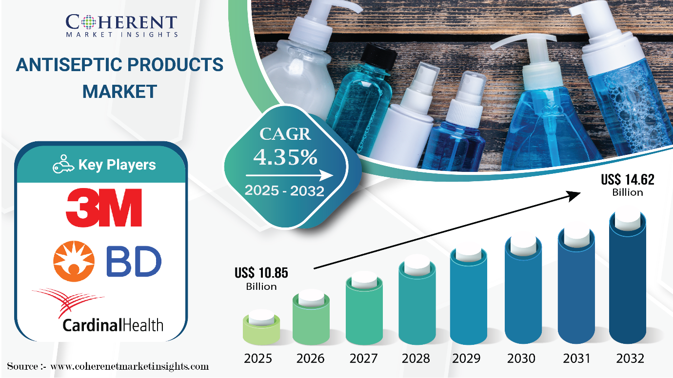According to Coherent Market Insights (CMI), the global antiseptic products market size is projected to grow at a CAGR of 4.3% during the assessment period, reaching USD 10.85 Bn in 2025 and USD 14.62 Bn by 2032.