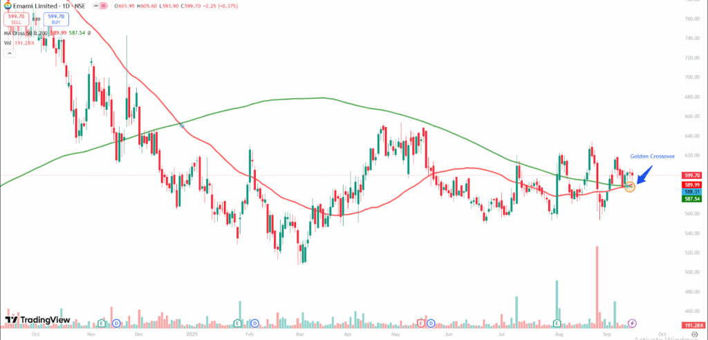The golden crossover took place on September 11, 2025, at a price of Rs. 588.31 with decent volumes of 221.44 K shares. The stock closed at Rs. 599.70 in Friday’s session, reflecting a 0.35 percent decrease from the crossover date.