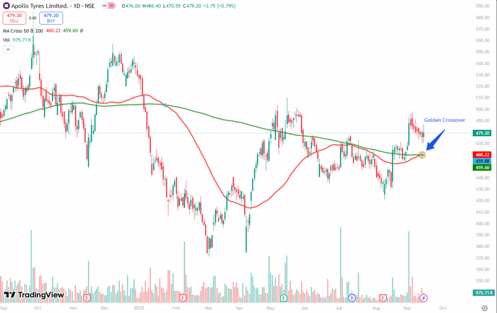 The golden crossover took place on September 12, 2025, at a price of Rs. 459.88 with decent volumes of 1.39 M shares. The stock closed at Rs. 479.20 in Monday’s session, reflecting a 0.75 percent increase from the crossover date.