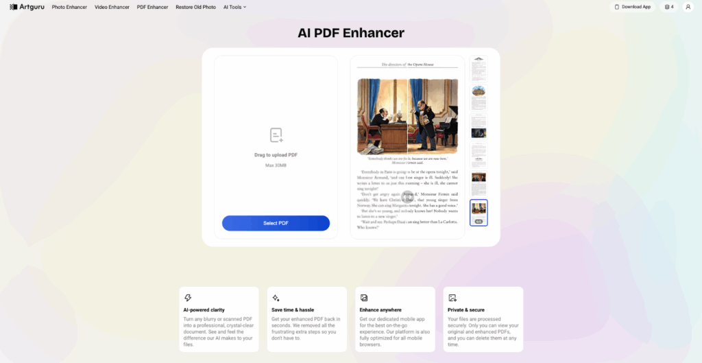 Instead of rescanning documents or editing them manually, users can upload PDFs to Artguru and receive clearer results in seconds.