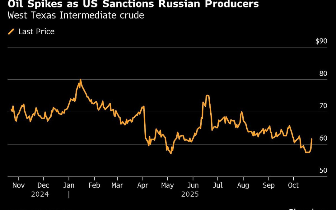 West Texas Intermediate jumped 5.6% to settle near $62 a barrel on Thursday, the most since the start of the Israel-Iran conflict on June 13. The latest US oil sanctions signaled a major policy turn from the Group-of-Seven price cap strategy that sought to limit Russia’s earnings without disrupting supply or driving up global prices.