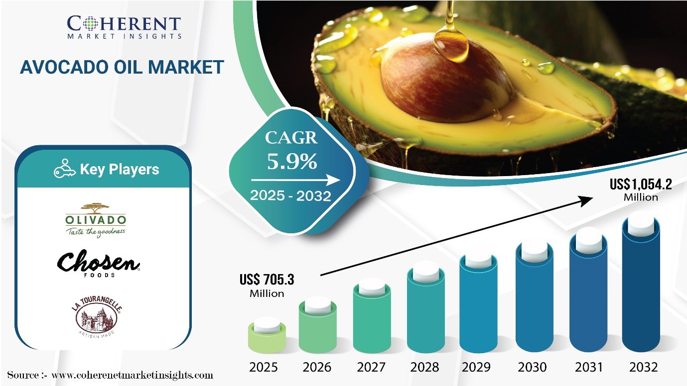 Burlingame, CA, April 14, 2025 (GLOBE NEWSWIRE) — According to a recent report by Coherent Market Insights, the global avocado oil market is valued at USD 705.3 million in 2025 and is projected to reach approximately USD 1,054.2 million by 2032, growing at a compound annual growth rate (CAGR) of 5.9% between 2025 and 2032.