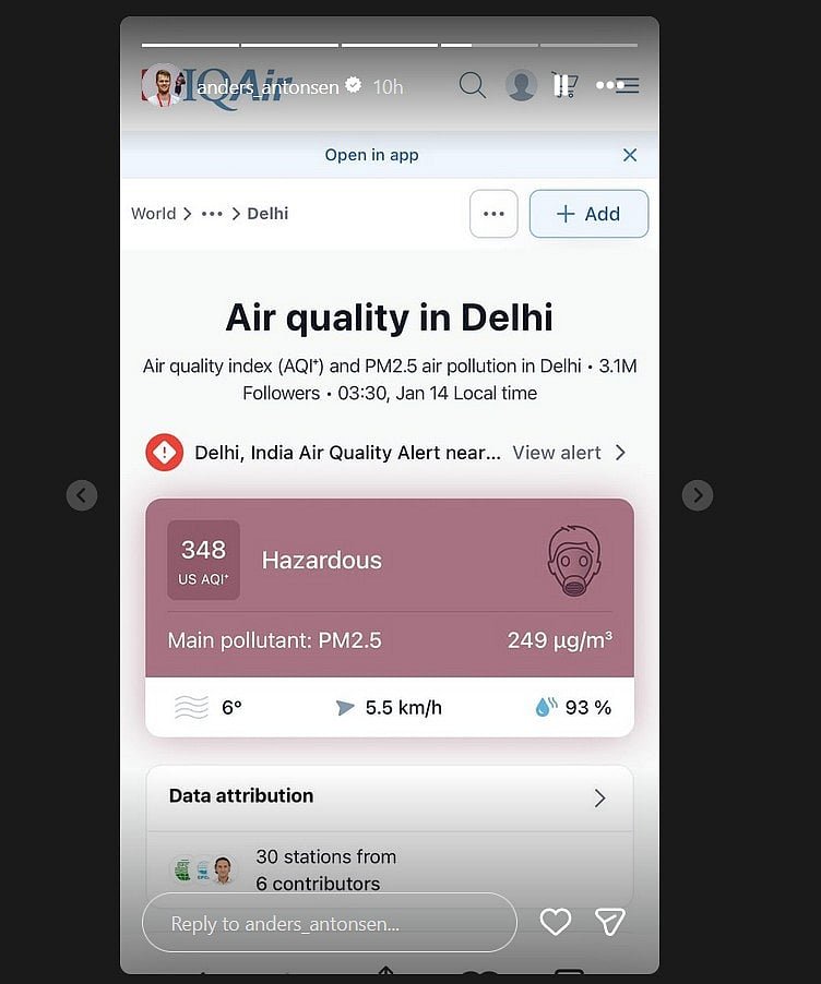 The 28-year-old also shared a screen shot of IQ Air, a website and an app that monitors the air quality, showing Delhi’s poor AQI on his Instagram story.