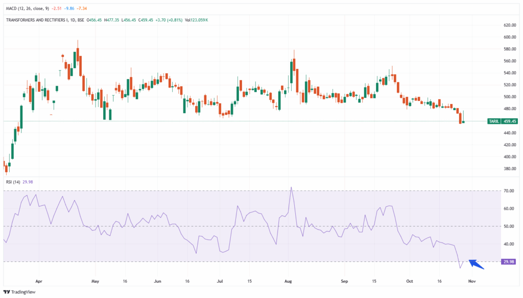 With market capitalization of Rs. 13,791 cr, the shares of Transformers and Rectifiers (India) Ltd are closed at Rs. 459.45 per share, from its previous close of Rs. 455.75 per share. With an RSI of 29.98, the stock is currently in oversold territory and could draw investor interest for a potential rebound if buying momentum picks up.