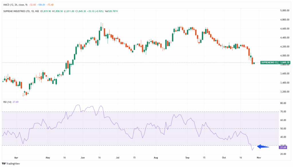 With market capitalization of Rs. 48,818 cr, the shares of Supreme Industries Ltd are closed at Rs. 3,849.30 per share, from its previous close of Rs. 3,814.20 per share. With an RSI of 27.69, the stock is currently in oversold territory and could draw investor interest for a potential rebound if buying momentum picks up.