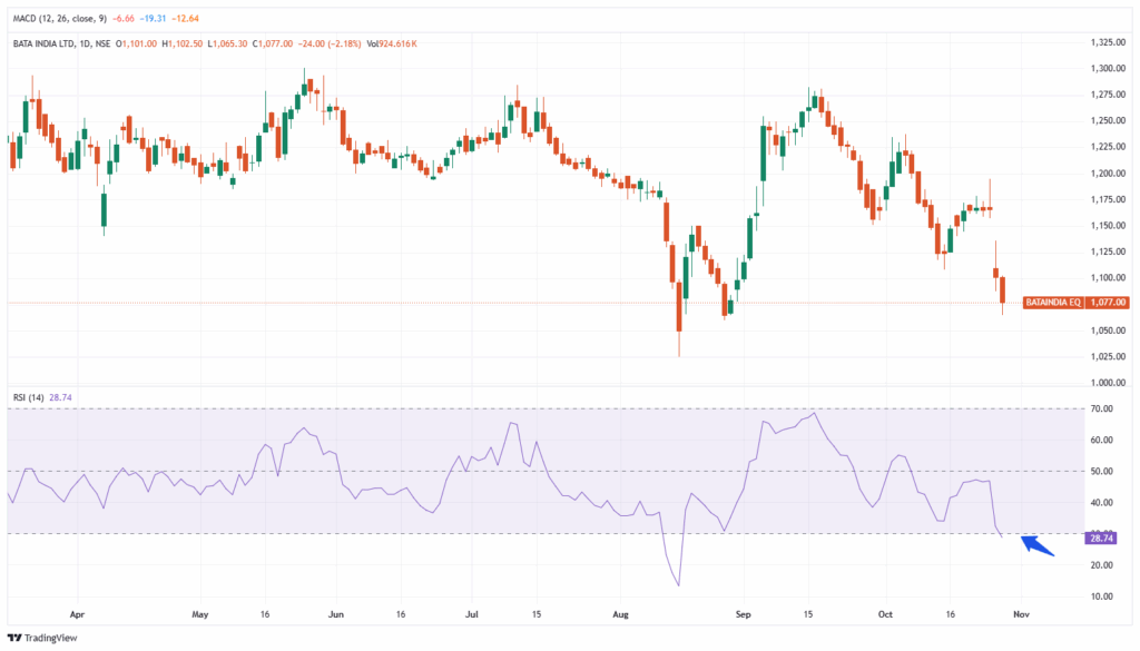 With market capitalization of Rs. 13,847 cr, the shares of Bata India Ltd are closed at Rs. 1,077 per share, from its previous close of Rs. 1,101 per share. With an RSI of 28.74, the stock is currently in oversold territory and could draw investor interest for a potential rebound if buying momentum picks up.