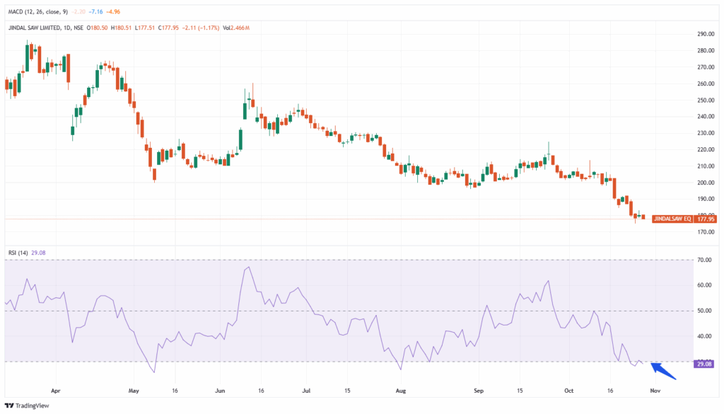 With market capitalization of Rs. 11,383 cr, the shares of Jindal Saw Ltd are closed at Rs. 178 per share, from its previous close of Rs. 179.90 per share. With an RSI of 29.34, the stock is currently in oversold territory and could draw investor interest for a potential rebound if buying momentum picks up.