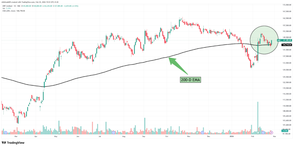 MRF Limited is taking support of the 200-day exponential moving average (200-D EMA) at a price of approximately Rs. 1,44,718.04. The stock closed at Rs. 1,47,585 in Wednesday’s session, reflecting a 2.53 percent increase in the intraday trade.