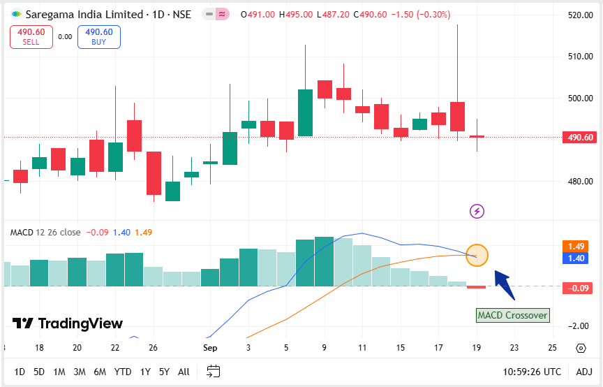 Saregama India Limited, has recently shown a bearish MACD crossover, with the MACD line slipping under the signal line. Such a setup often signals weakening momentum, hinting at possible downside pressure and cautioning traders of a likely correction or continuation of a downward trend.