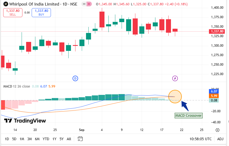 Whirlpool Of India Limited is showing a bearish MACD crossover, where the MACD line falls below the signal line. This typically indicates weakening momentum and a potential price decline, signaling traders to be cautious or consider selling.
