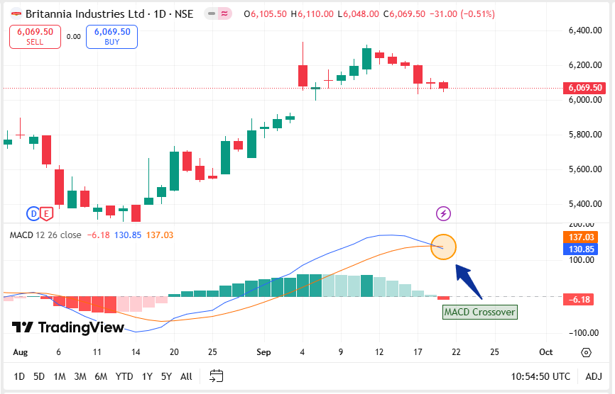 Britannia Industries Limited has formed a bearish MACD crossover, with the MACD line crossing under the signal line. This suggests weakening momentum and potential downward movement, signaling a possible selling opportunity for traders.