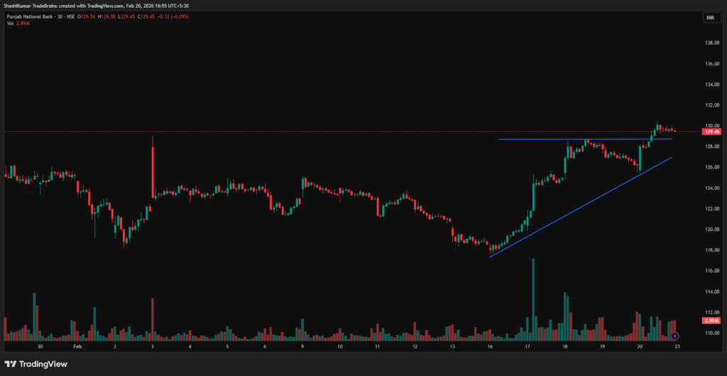 An ascending triangle is a bullish pattern with higher lows and a flat resistance, indicating rising buying pressure toward a potential breakout. The chart shows a bullish breakout above the horizontal resistance. Backed by strong volume, it indicates increasing buying pressure and a likely short-term upward move. On Friday, Punjab National Bank broke above the ascending triangle’s neckline on the 30-minute chart and stayed above Rs 128.7, boosting its bullish momentum.
