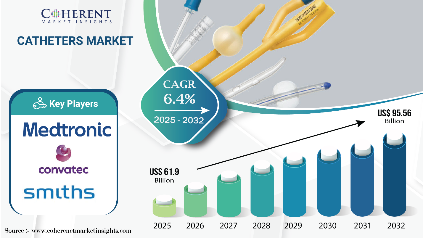 According to Coherent Market Insights (CMI), the global catheters market size is expected to be valued at USD 61.9 Bn in 2025 and further grow at a CAGR of 6.4%, surpassing USD 95.56 Bn by 2032.
