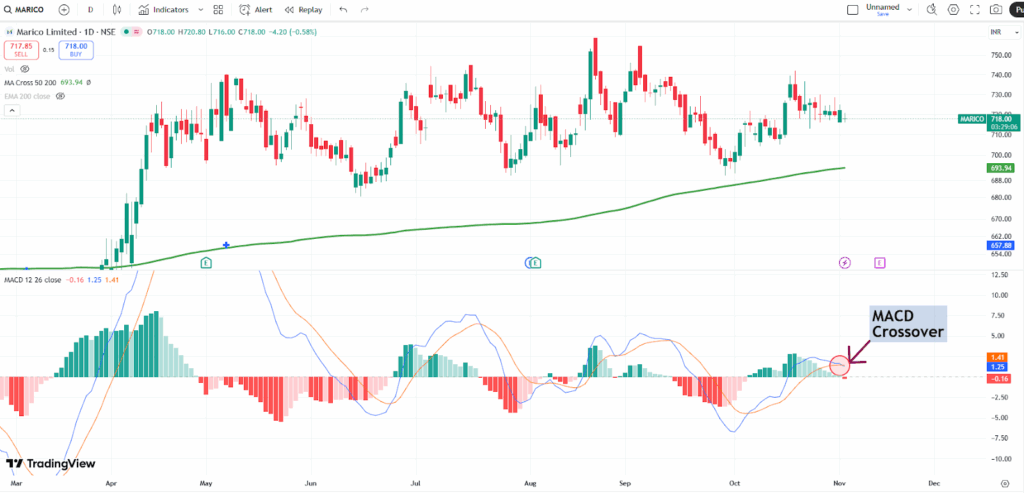A bearish MACD crossover was seen in Marico as the MACD line crossed below the signal line, signaling potential downward momentum. This technical pattern is considered a sell signal and may indicate the start of a new downtrend, prompting traders to be cautious or consider exiting long positions.