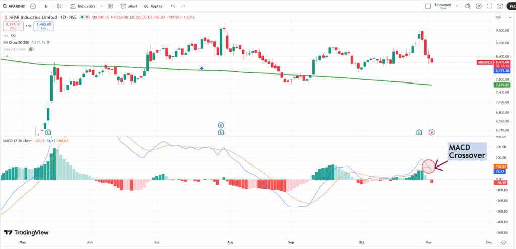 A bearish MACD crossover was seen in Apar Industries as the MACD line crossed below the signal line, signaling potential downward momentum. This technical pattern is considered a sell signal and may indicate the start of a new downtrend, prompting traders to be cautious or consider exiting long positions.