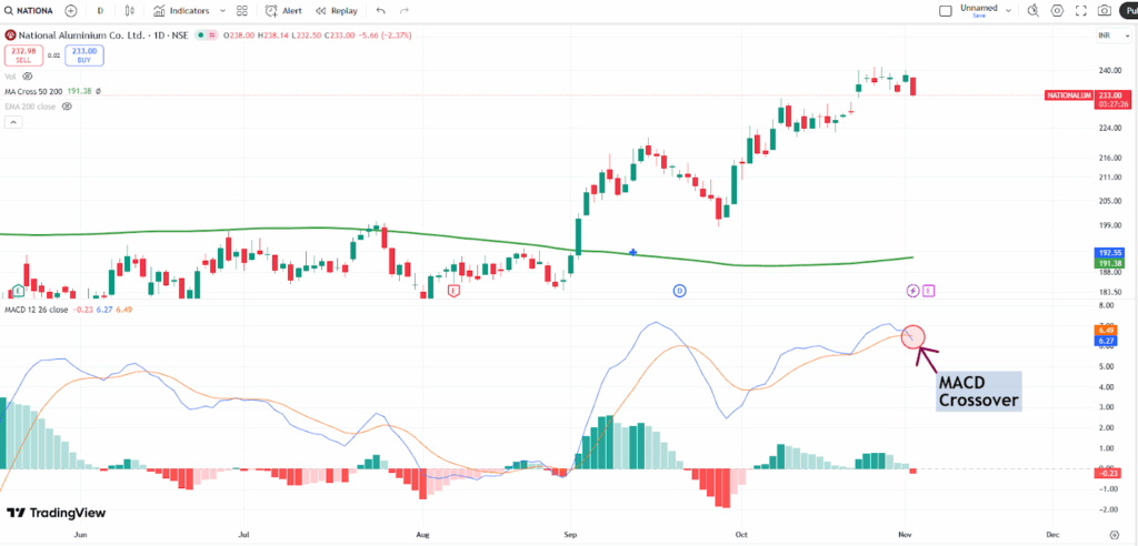 A bearish MACD crossover was seen in National Aluminium Company as the MACD line crossed below the signal line, signaling potential downward momentum. This technical pattern is considered a sell signal and may indicate the start of a new downtrend, prompting traders to be cautious or consider exiting long positions.