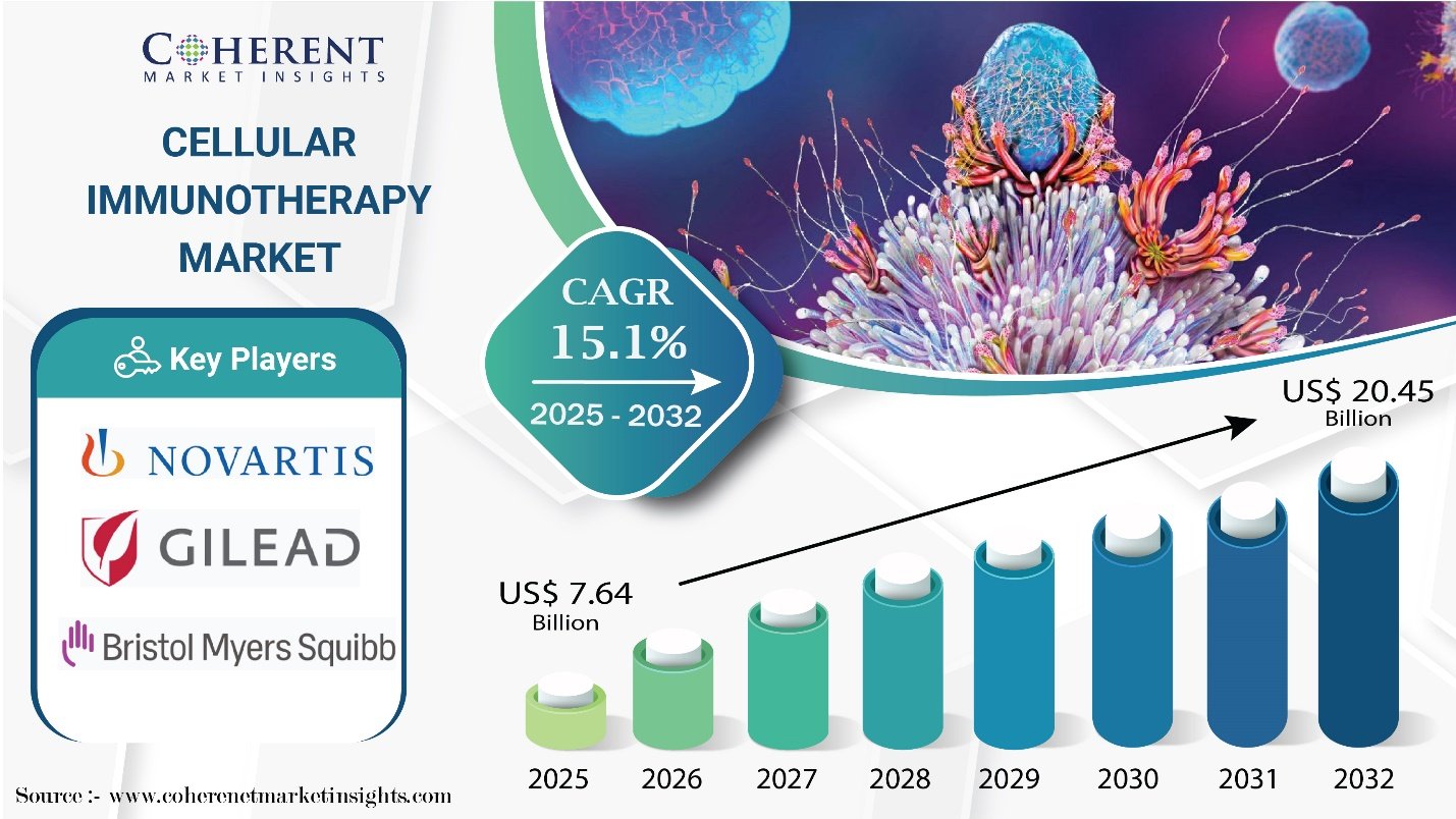According to Coherent Market Insights (CMI), the global cellular immunotherapy market size is expected to grow nearly 2.7X during the forecast period, totaling USD 20.45 Bn by 2032, up from USD 7.64 Bn in 2025.