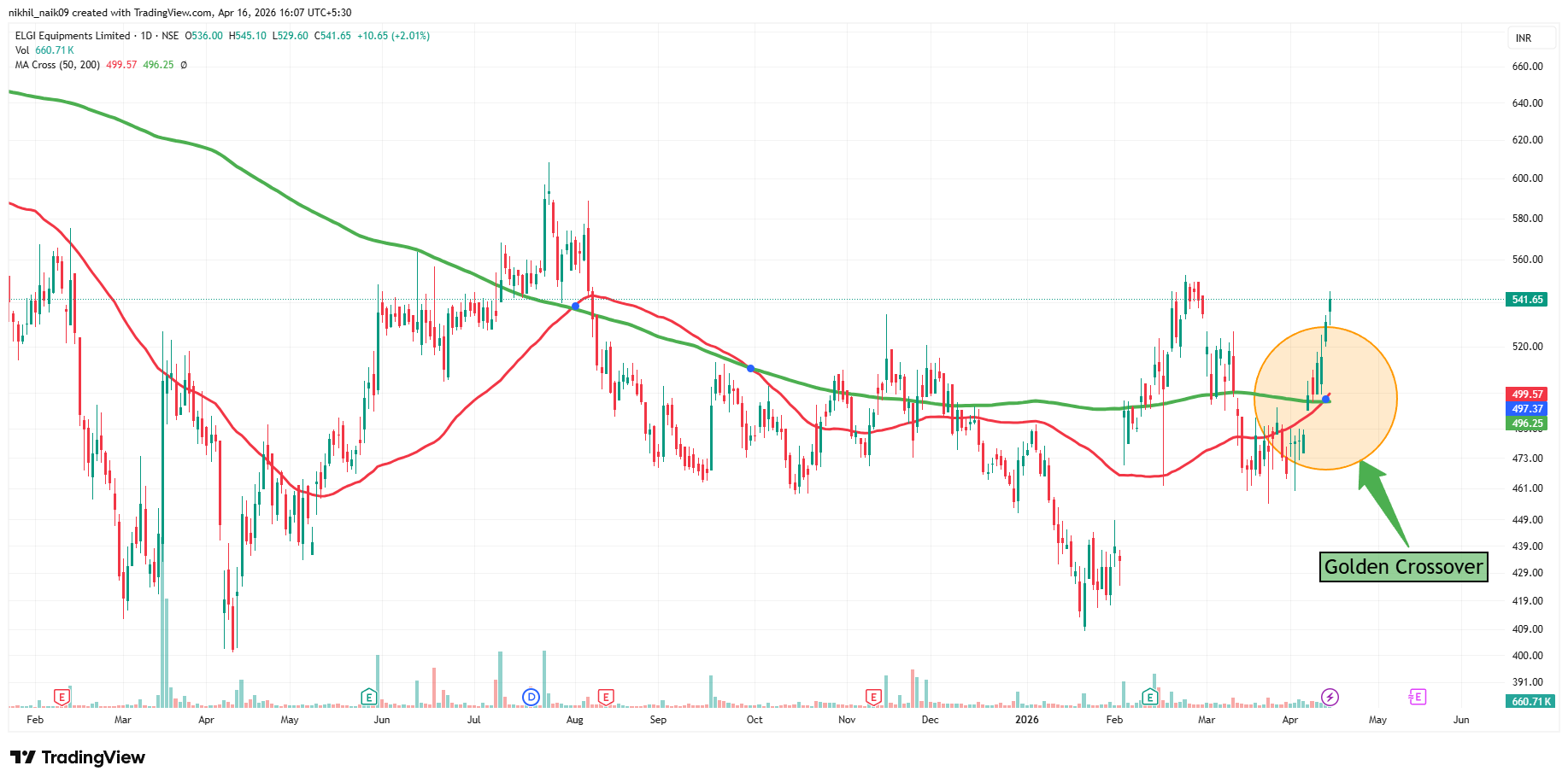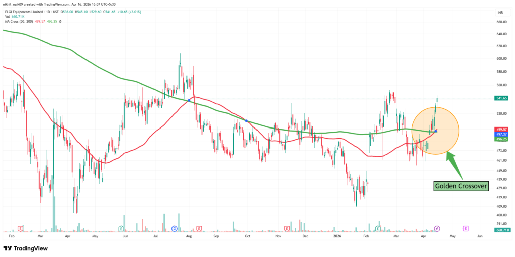 The golden crossover took place on April 15, 2026, at a price of Rs. 497.37 with decent volumes of 545.93 K shares. The stock is currently trading at Rs. 541.65 in Thursday’s session, reflecting a 2.01 percent increase in the intraday trade.