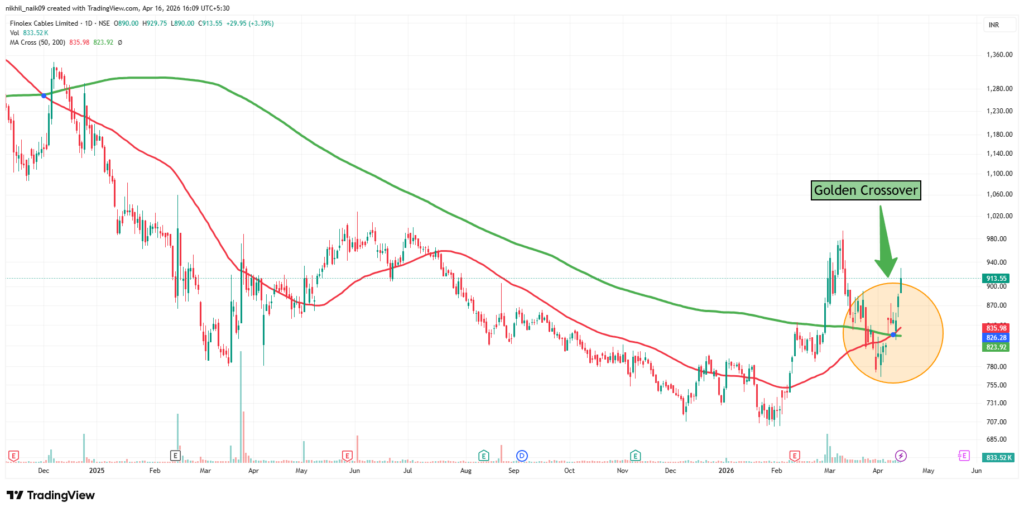 The golden crossover took place on April 10, 2026, at a price of Rs. 826.28 with decent volumes of 286.83 K shares. The stock is currently trading at Rs. 913.55 in Thursday’s session, reflecting a 3.39 percent increase in the intraday trade.