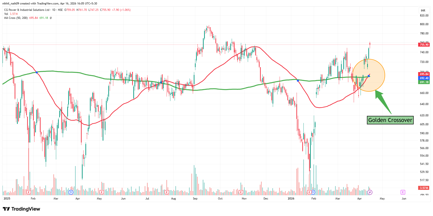 The golden crossover took place on April 15, 2026, at a price of Rs. 692.40 with decent volumes of 4.1 million shares. The stock is currently trading at Rs. 755.90 in Thursday’s session, reflecting a 1.06 percent increase in the intraday trade.
