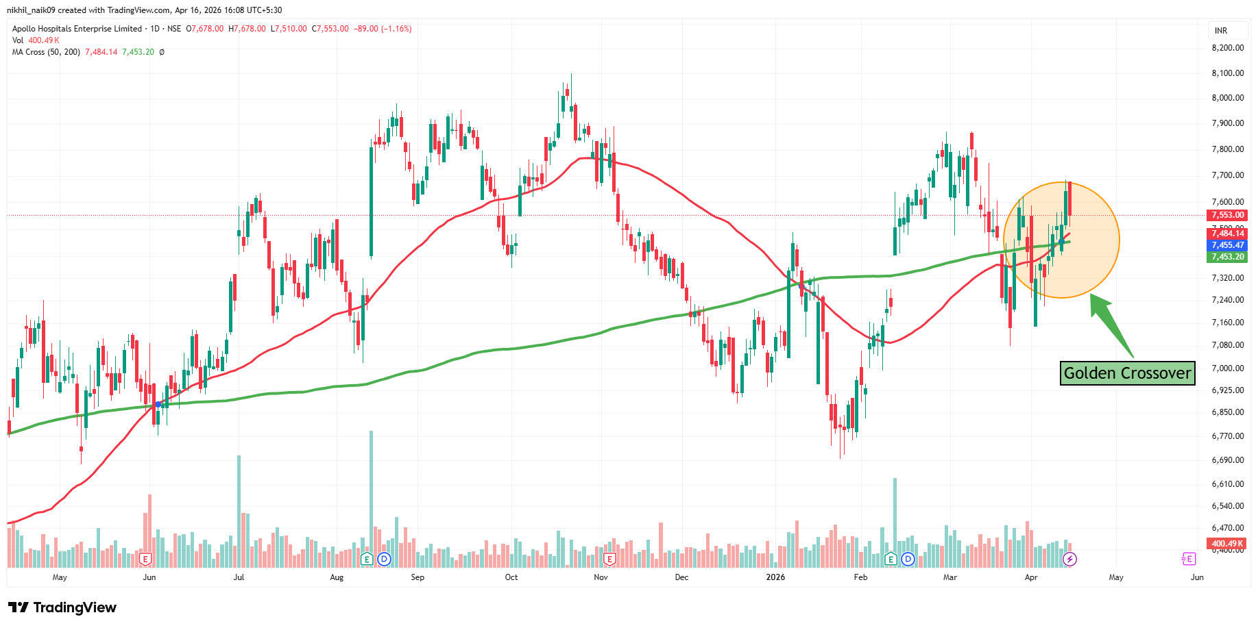 The golden crossover took place on April 13, 2026, at a price of Rs. 7,455.47 with decent volumes of 310.57 K shares. The stock is currently trading at Rs. 7,553 in Thursday’s session, reflecting a 1.16 percent decrease in the intraday trade.