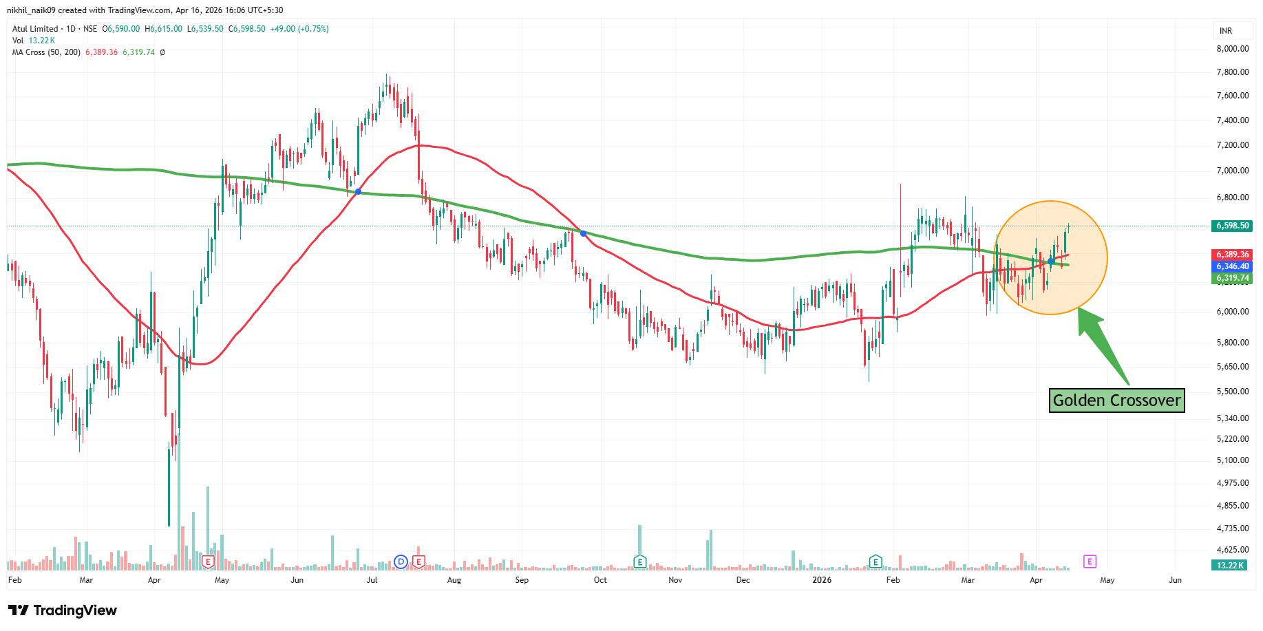 The golden crossover took place on April 8, 2026, at a price of Rs. 6,346.40 with decent volumes of 11.93 K shares. The stock is currently trading at Rs. 6,598.50 in Thursday’s session, reflecting a 0.75 percent increase in the intraday trade.