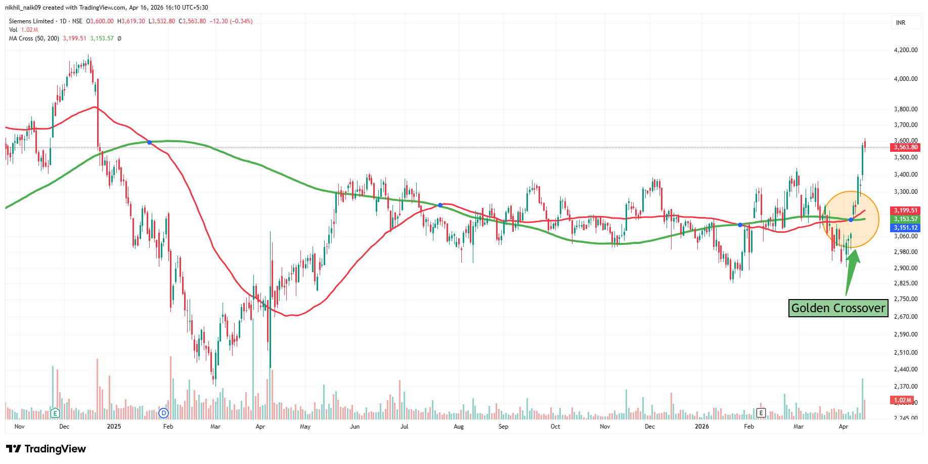 The golden crossover took place on April 7, 2026, at a price of Rs. 3,151.12 with decent volumes of 184.68 K shares. The stock is currently trading at Rs. 3,563.80 in Thursday’s session, reflecting a 0.34 percent decrease in the intraday trade.