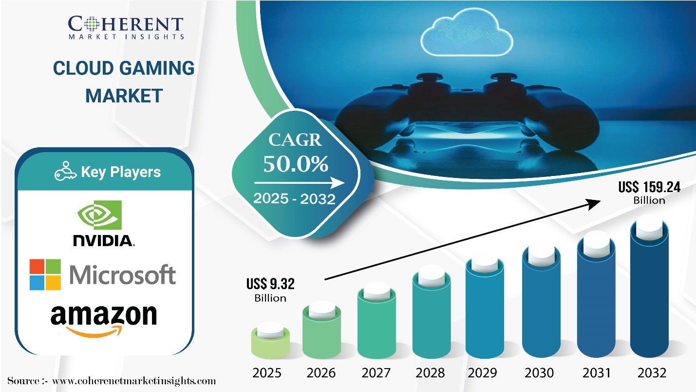 Burlingame, CA, April 14, 2025 (GLOBE NEWSWIRE) — According to a recent report by Coherent Market Insights, the global cloud gaming market is projected to be valued at USD 9.32 billion in 2025 and is expected to soar to approximately USD 159.24 billion by 2032, growing at a remarkable CAGR of 50.0% from 2025 to 2032.