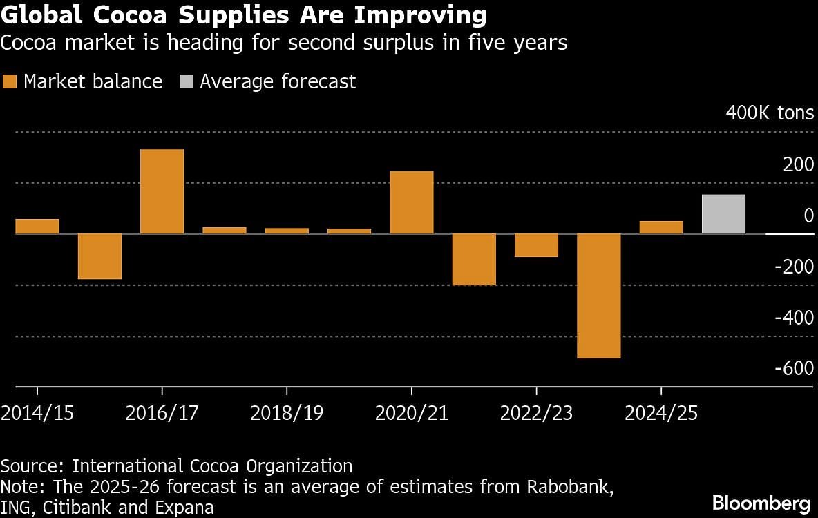 Some of the biggest chocolate makers are staying away from signaling any changes, citing volatility on the cocoa market. Kit Kat-maker Nestle SA said that while recent shifts in prices were encouraging, it’s still too early to comment on specific changes. Hershey Co., which produces Reese’s Peanut Butter Cups, expected some “deflation” to start happening “deeper into 2026,” Chief Financial Officer Steve Voskuil said on an earnings call in October.
