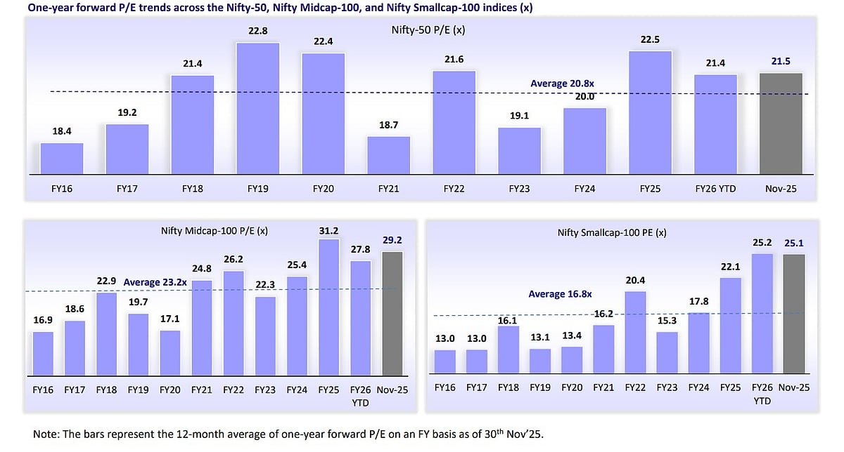 From a valuation standpoint, Nifty’s one-year forward P/E stands at 21.5x, around 4% above its long-period average of 20.8x, according to Motilal Oswal. Valuations in the broader market remain elevated.
