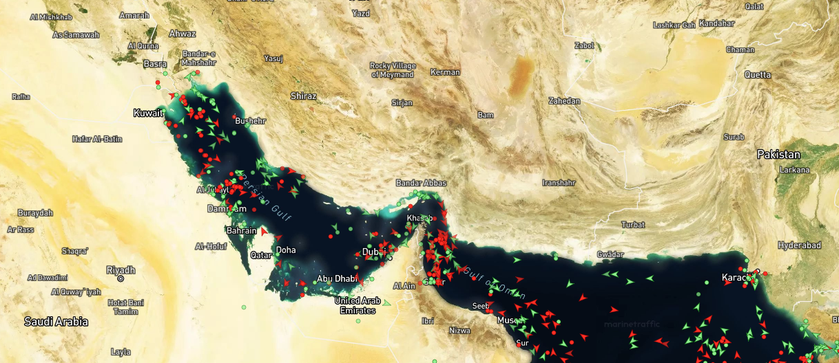 Strait of Hormuz (Red: Oil Tankers, Green: Dry Cargo)