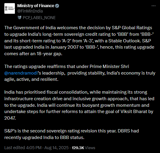A major macro development during this period was the sovereign rating upgrade for India. S&P Global Ratings upgraded India’s long-term sovereign credit rating from ‘BBB-’ to ‘BBB’, marking the first upgrade in 18 years, while also raising the short-term rating from ‘A-3’ to ‘A-2’ and the transfer and convertibility assessment from ‘BBB+’ to ‘A-’ with a stable outlook. The agency said the upgrade reflected India’s strong economic growth and improved monetary policy framework that anchors inflation expectations. The Finance Ministry welcomed the move and noted that Morning Star DBRS had also upgraded India to ‘BBB’ status.