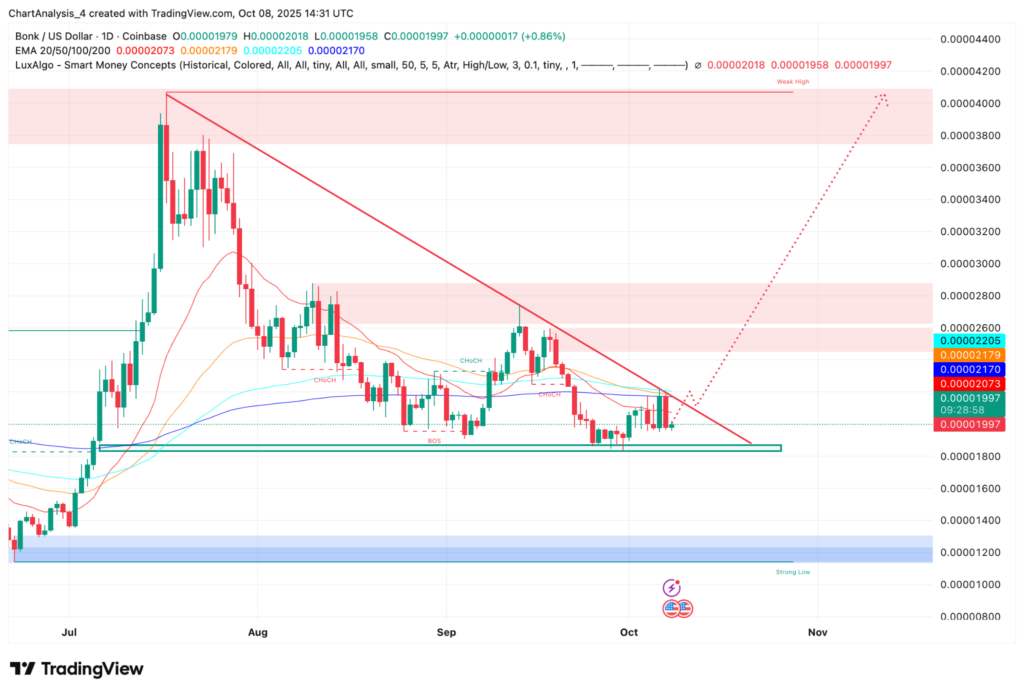 The daily chart reveals BONK pressing against a long-term descending trendline near $0.000022, with multiple failed retests since July.