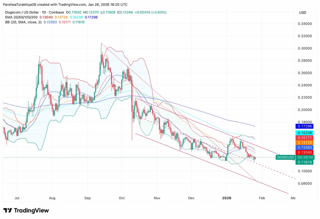 After reaching highs around $0.30-$0.32 in September 2025, DOGE has crashed approximately 60% to current levels.