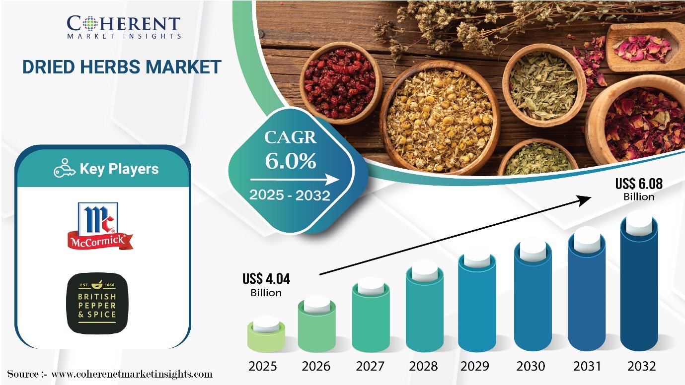 Burlingame, CA, April 14, 2025 (GLOBE NEWSWIRE) — According to a recent report by Coherent Market Insights, the global dried herbs market is projected to be valued at USD 4.04 billion in 2025 and is expected to soar to approximately USD 6.08 billion by 2032, growing at a remarkable CAGR of 6.0% from 2025 to 2032.