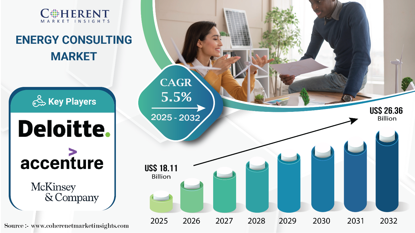 According to Coherent Market Insights (CMI), the global energy consulting market size is projected to total USD 18.11 Bn in 2025 and USD 26.36 Bn by 2032, recording a CAGR of 5.5%.