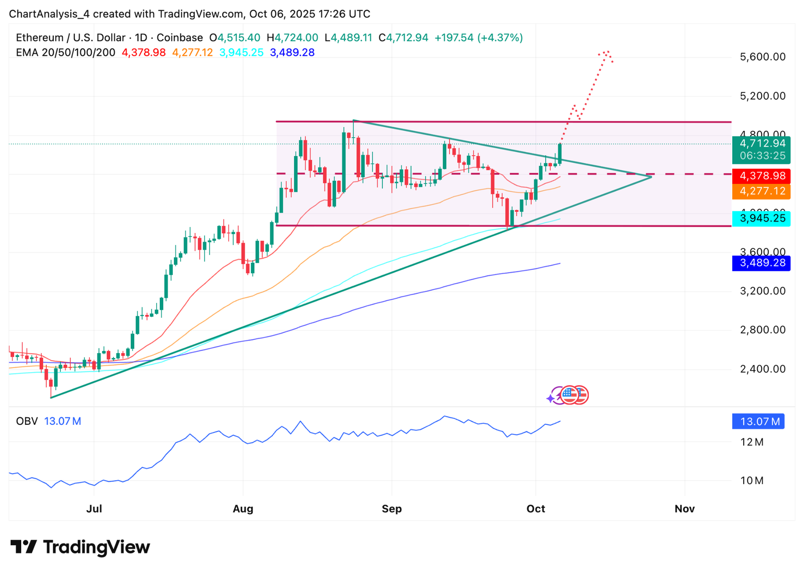Ethereum has broken above the triangle structure that capped price since August, with buyers lifting the token through $4,600 resistance.