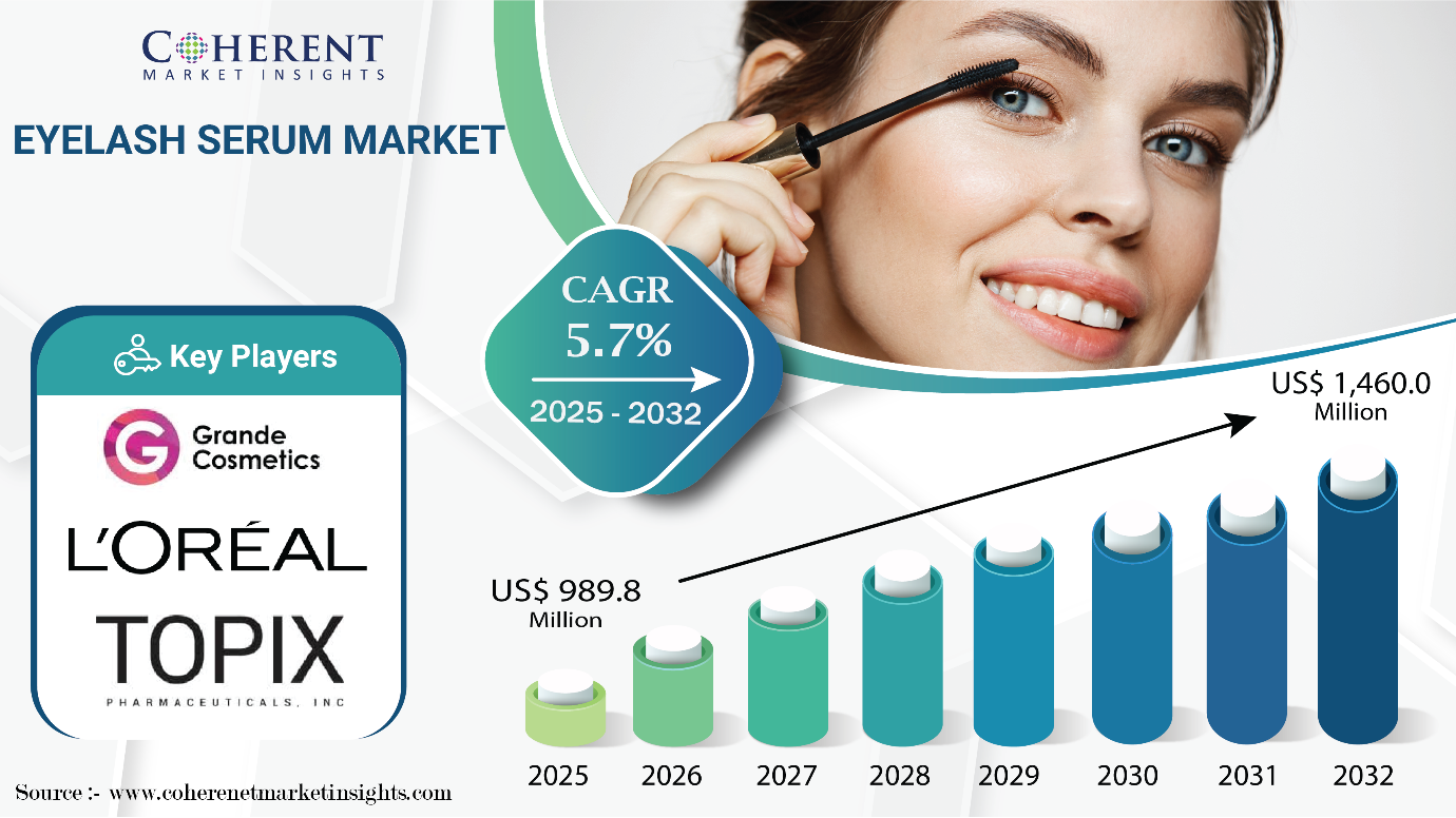 According to Coherent Market Insights (CMI), the global eyelash serum market size is projected to grow at a CAGR of 5.7%, expanding from USD 989.9 Mn in 2025 to USD 1,460 Mn by 2032.